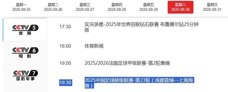 本轮联赛,CCTV5+直播武汉三镇VS上海申花,CCTV5直播成都蓉城VS上海海港,CCTV16直播山东泰山VS北京国安!8月28日,海港飞抵成都。双方都将以残阵相搏,蓉城边后卫胡荷韬入选U22国家队,元敏诚、杨明洋、莱切特都有伤。海港队中场茹萨停赛,蒯纪闻、李新翔、吾米提江三名球员也被U22国家队抽调。