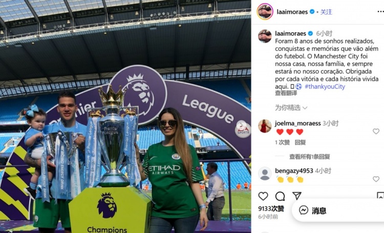 9月3日,埃德森转会费内巴切后,其妻子通过社交媒体向曼城深情告别。