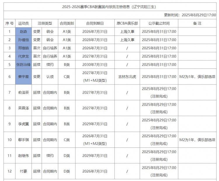 距离CBA转会注册截止日越来越近,各队纷纷上报新赛季注册名单。据CBA官网消息,辽宁男篮提报了12人注册名单,其中新增6人。前吉林队当家球星姜宇星两年C类加盟,赵森、孙福恒从上海转会而来,邢维皓、代彦龙两位小将从青年队升入一队,韩德君接班人张陈治锋B类合同续约五年。